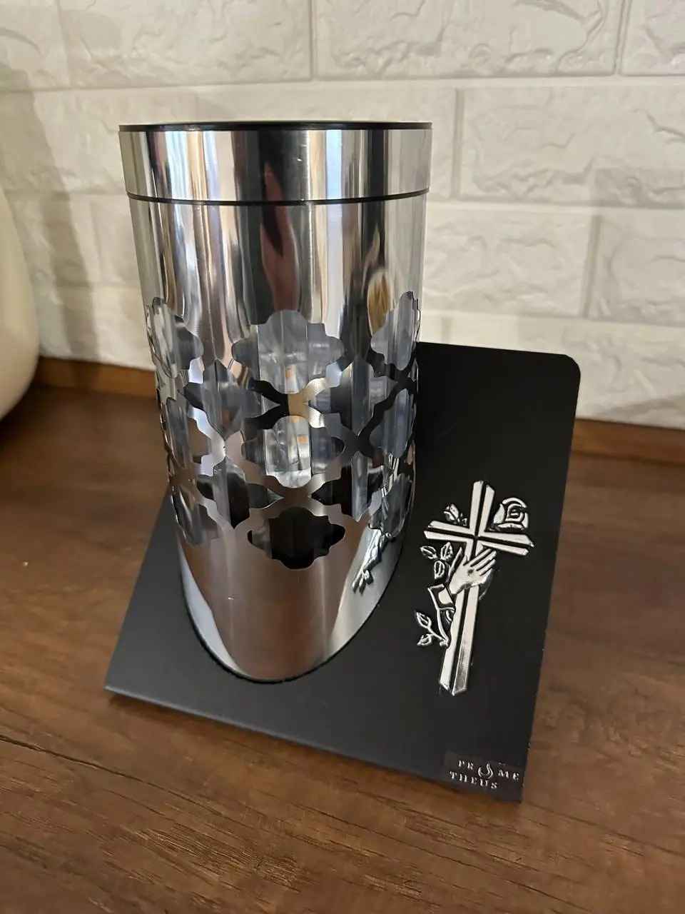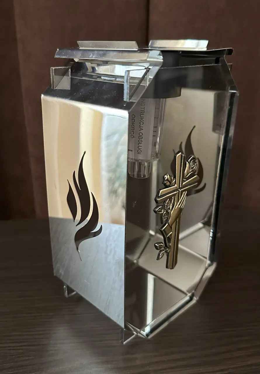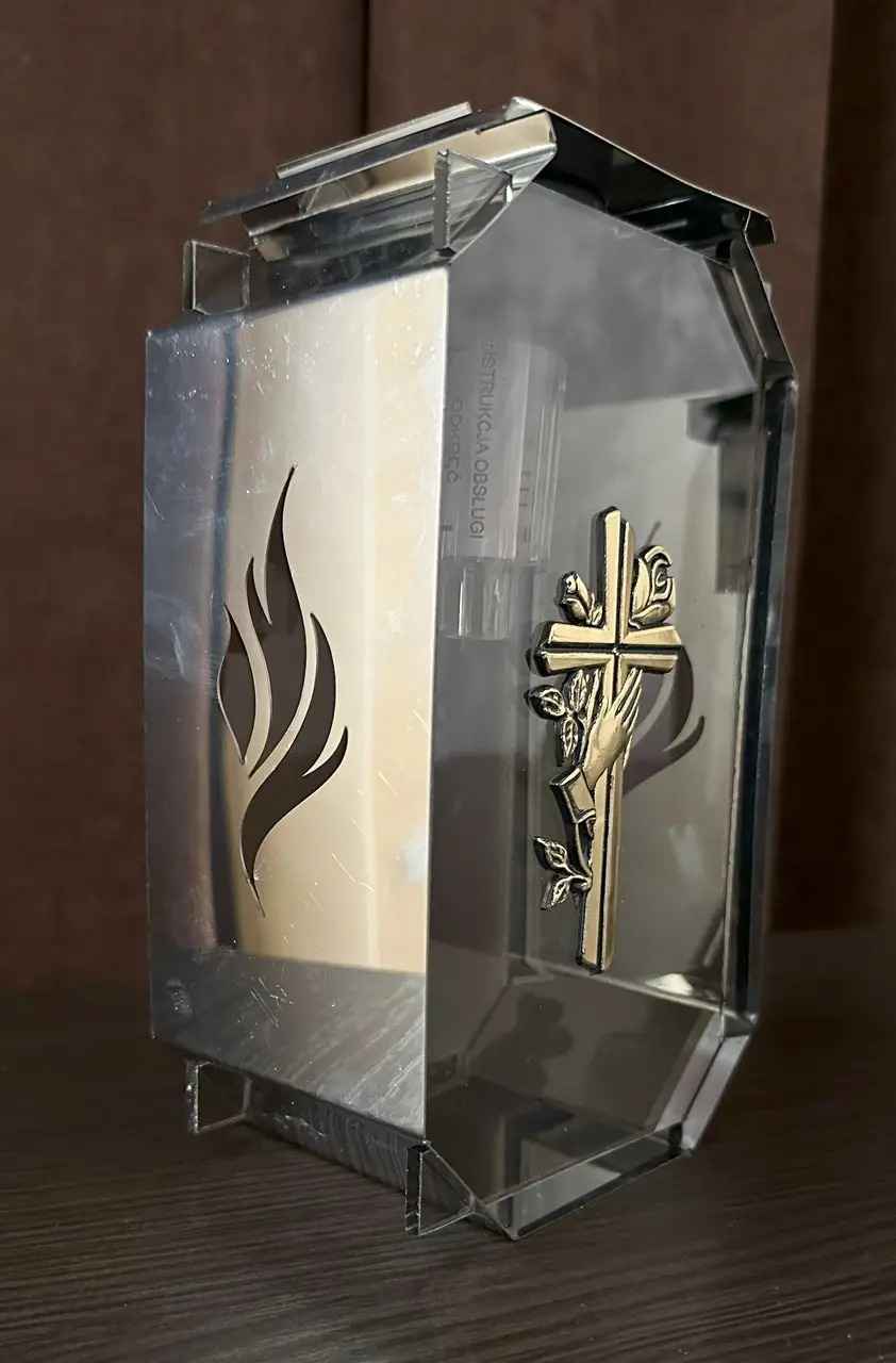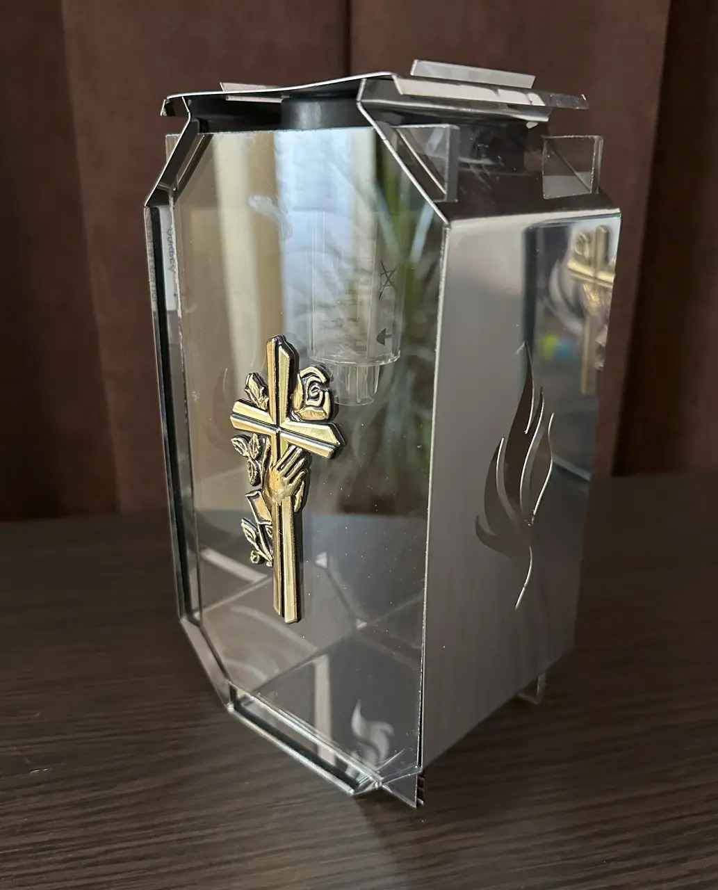 Матеріал: спереду скло, навколо пластик, низ та верх, лампадки виготовлений із пластику. Лампадка відкривається вгорі.