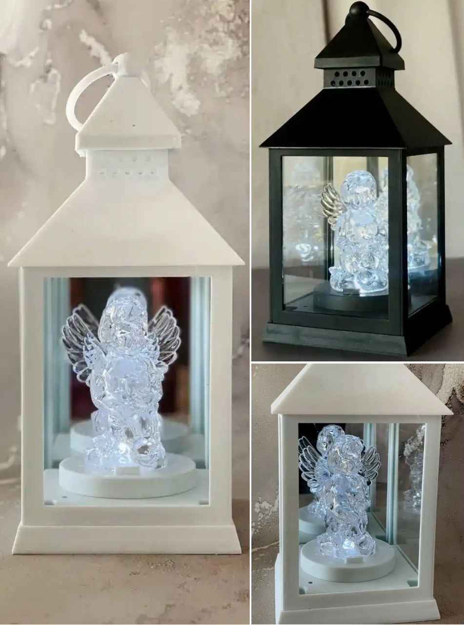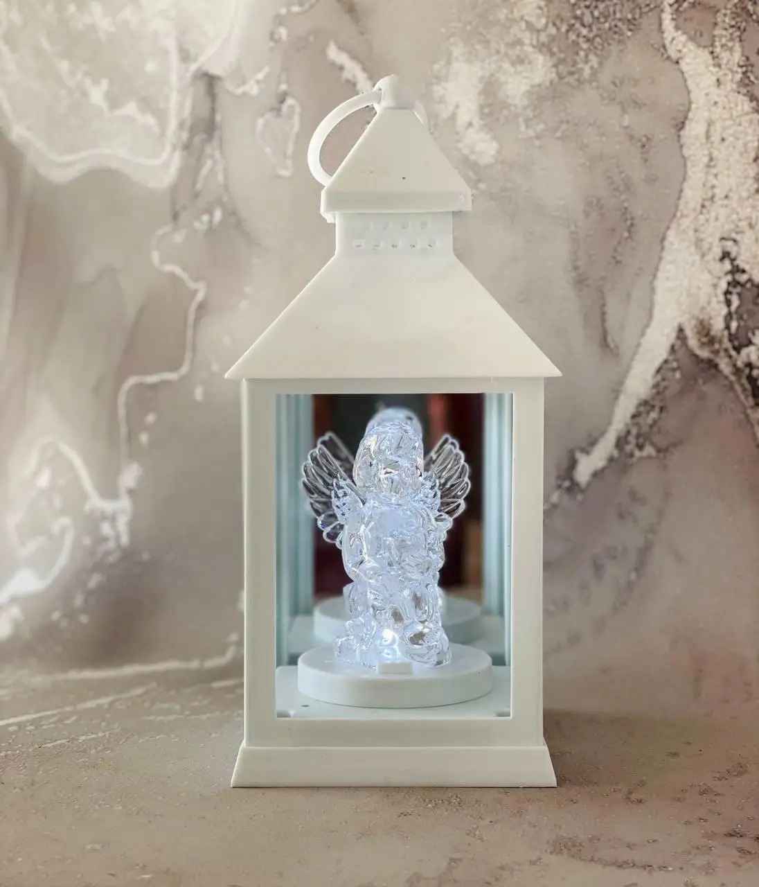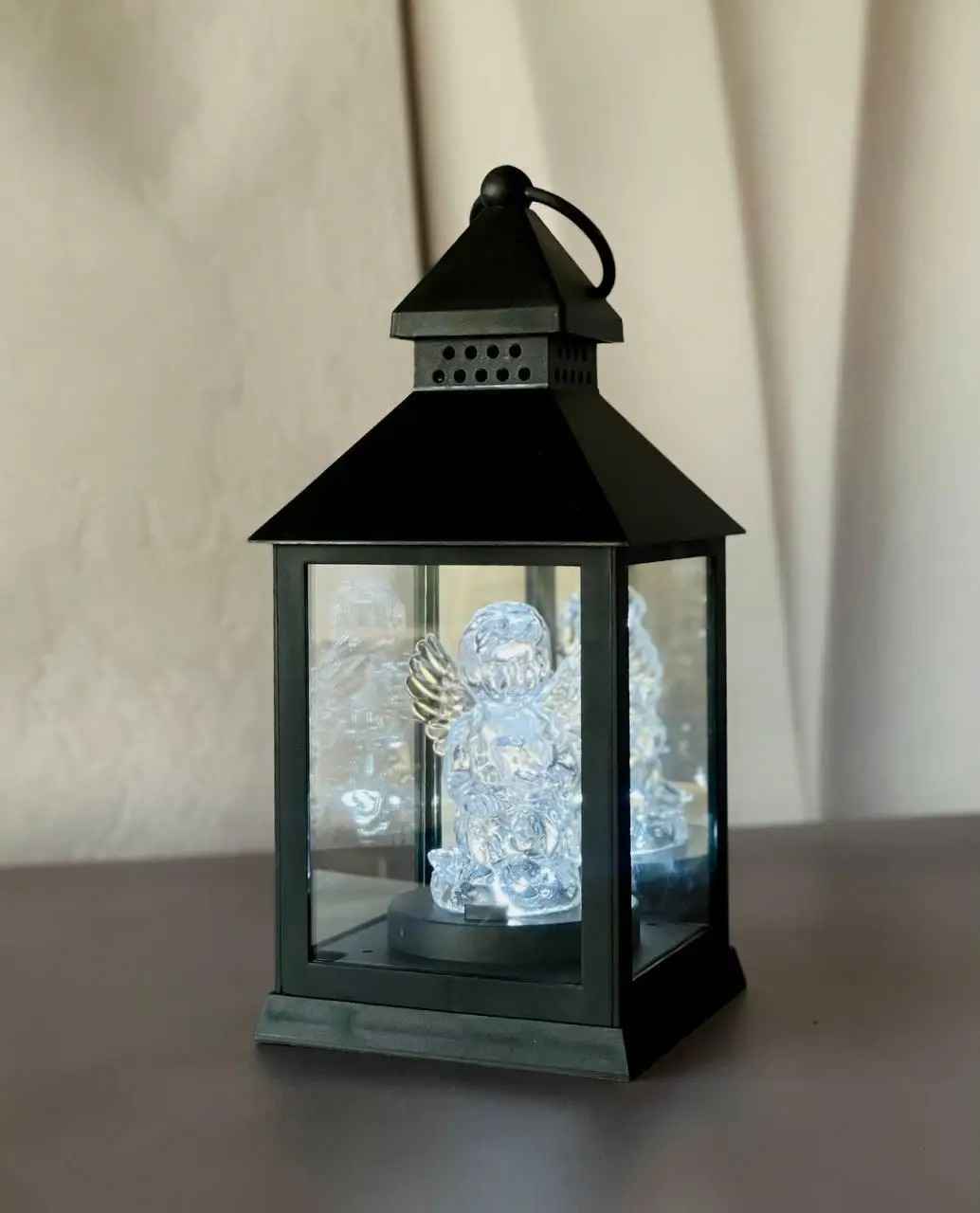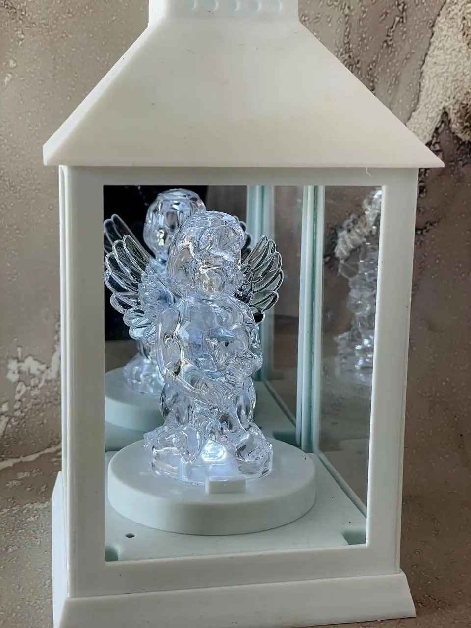 Вишуканий декоративний ліхтарик у класичному корпусі з прозорими стінками. Усередині - фігурка ангела з кришталевим ефектом, що м’яко підсвічується LED-світлом.