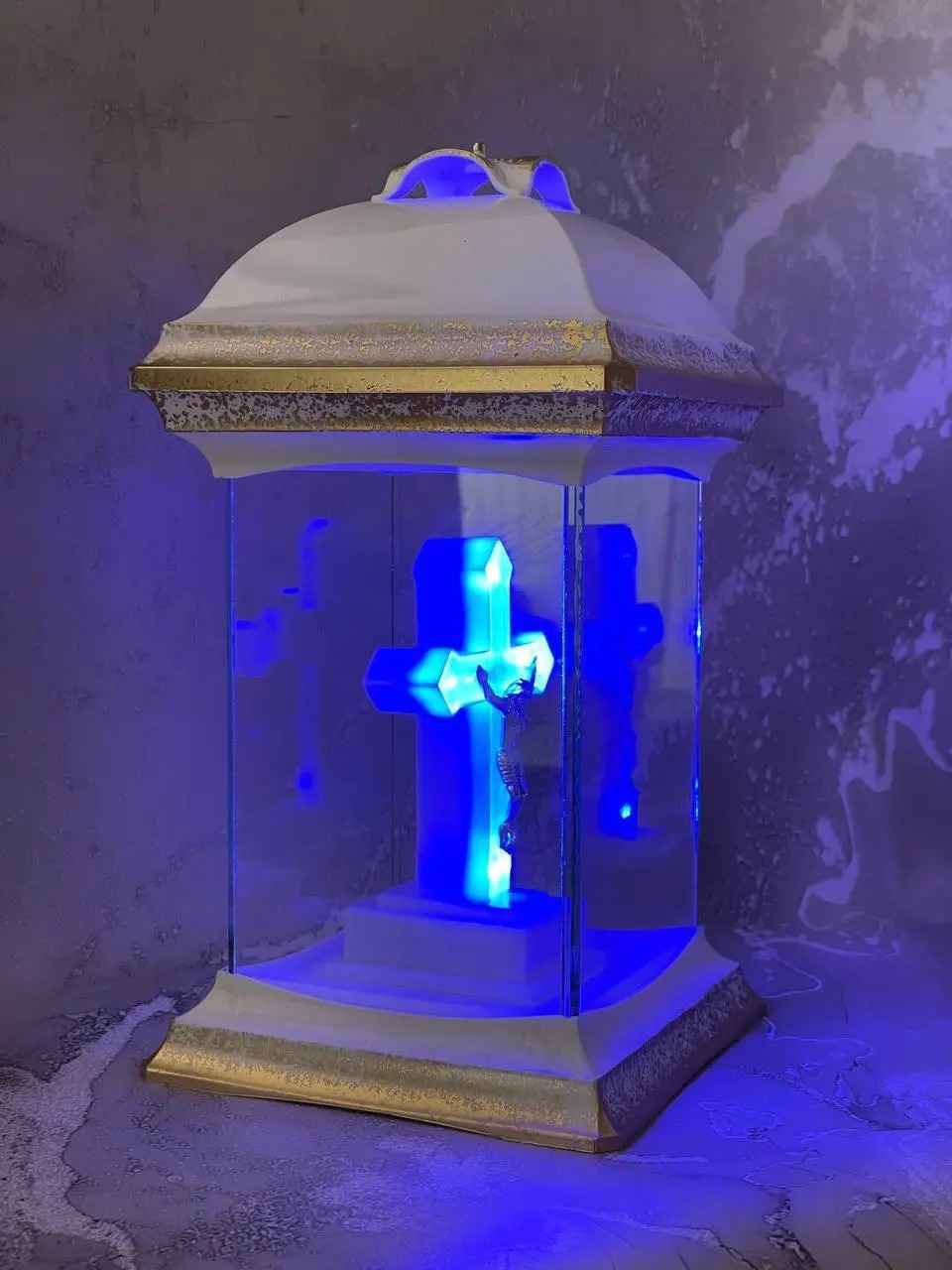 Матеріал: спереду скло, навколо пластик, низ та верх, лампадки виготовлений із пластику. Лампадка відкривається вгорі.